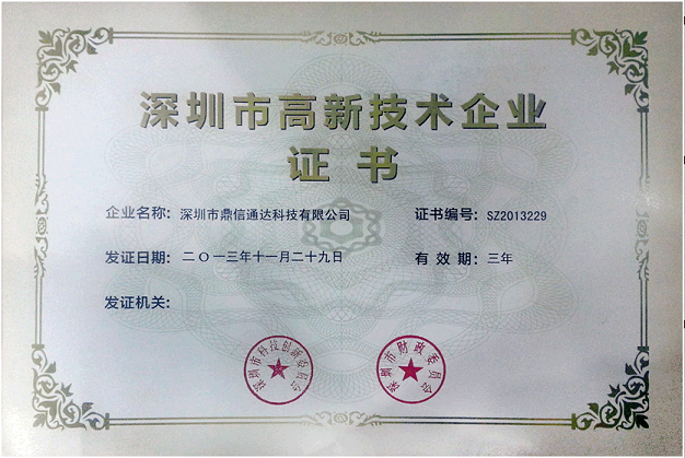 2013年11月29日,深圳市鼎信通達(dá)科技有限公司榮獲深圳市高新技術(shù)產(chǎn)業(yè)證書。該證書由深圳市科技創(chuàng)新委員會(huì)、深圳市財(cái)政委員會(huì)共同審核頒發(fā),有效期三年...