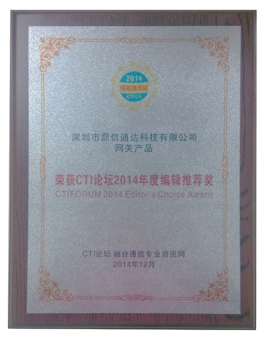 2014年深圳鼎信通達(dá)科技榮獲 CTI 編輯推薦獎(jiǎng), 12月5日,一年一度的CTI論壇2014年度“編輯推薦獎(jiǎng)”評(píng)選活動(dòng)揭曉,鼎信通達(dá)科技有限公司依托多...