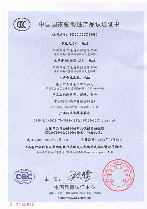 2015年5月,深圳市鼎信通達科技有限公司產(chǎn)品中繼網(wǎng)關(guān)MTG1000榮獲3C認證證書! 3C認證的全稱為“強制性產(chǎn)品認證制度”,它是中國政府為...